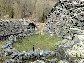 E l’angolino che ho trovato è un piccolo gruppo di casette Walser (forse) con piccoli spazi ricavati dalla montagna e recintati da pietre a secco, con erbetta e muschio e timidi bucaneve ormai alla fine della loro stagione…